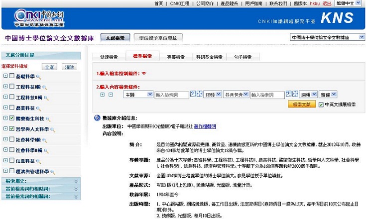 The China Doctoral/Master Dissertations Full-text Database contains full-text dissertations and theses from prestigious Chinese higher education institutions. Coverage is from 2000 to the present. In addition to the Medicine subset, the Library has recently added the Literature, History and Philosophy subset to its subscription.