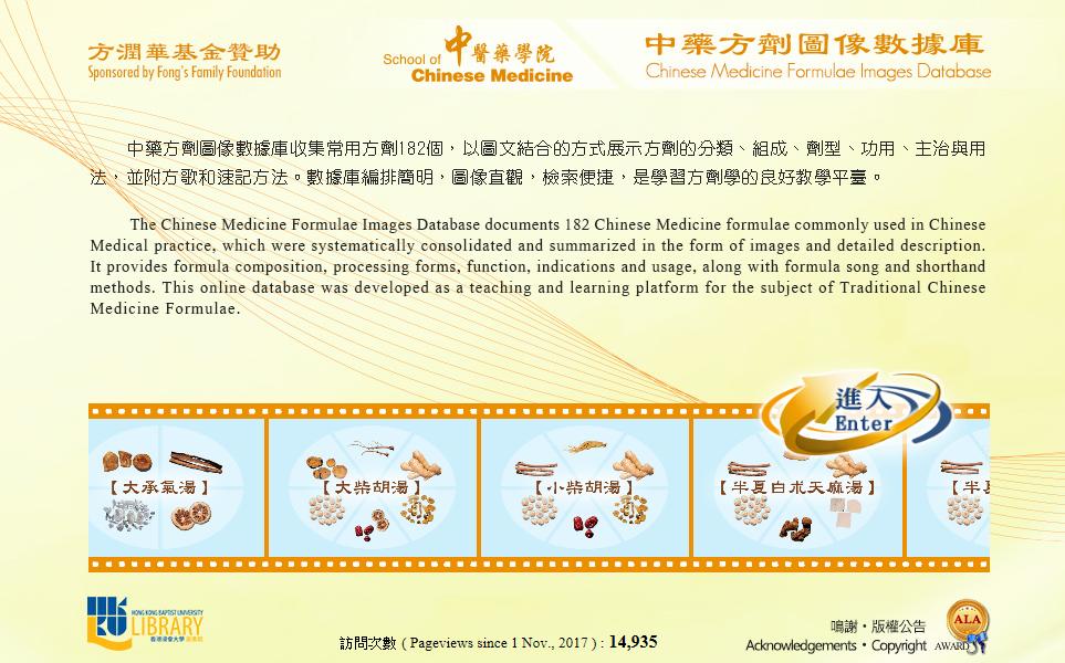 This database documents 182 Chinese Medicine formulae commonly used in Chinese medical practice. These have been systematically consolidated and summarized in the form of images and detailed description. It provides formula composition, processing forms, function, indications and usage, along with formula song and shorthand methods. Beyond its role in supporting teaching and learning at HKBU, this open access database will also help to popularize knowledge of Chinese Medicine among the general public.